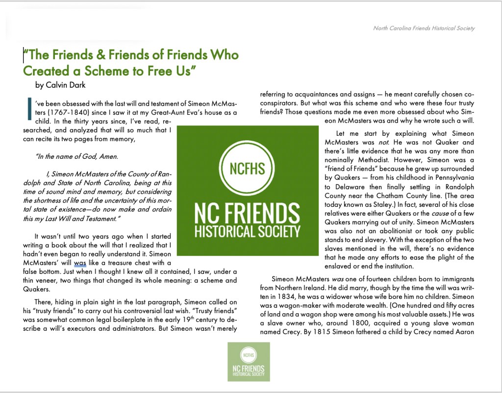 Next week, I was supposed to be the annual luncheon speaker for the North Carolina Friends Historical Society Conference (but #COVID19). At the luncheon, my presentation was supposed to be about my forthcoming book McMasters’ Will: How We Survived A Scheme & Became Virtually Free. The NC Friends Historical Society was gracious to send out my excerpt to their members and I am sharing it with you! SO. MUCH. MORE. TO. COME!