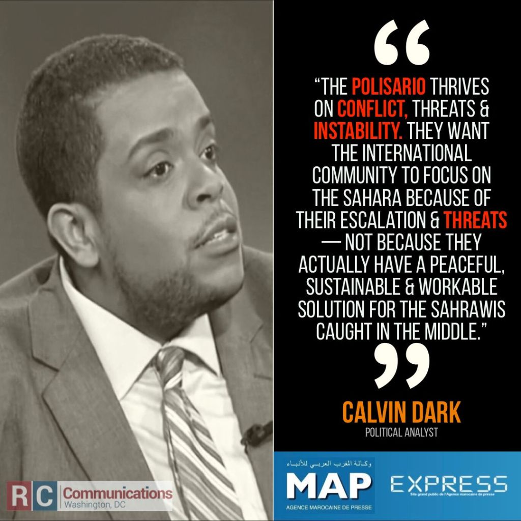 “Le polisario se nourrit des conflits, des menaces et de l’instabilité. Sans cela, il n’a aucune raison d’exister” et ce genre de troubles sont “préoccupants” pour les Etats-Unis, estime l’analyste américain, Calvin Dark relevant, dans un entretien à MAP Washington, que “les terroristes qui menacent notre pays ainsi que nos alliés prospèrent dans l’anarchie”. http://www.mapnews.ma/fr/actualites/politique/pour-lexpert-am%C3%A9ricain-calvin-dark-les-troubles-foment%C3%A9s-par-le-polisario
